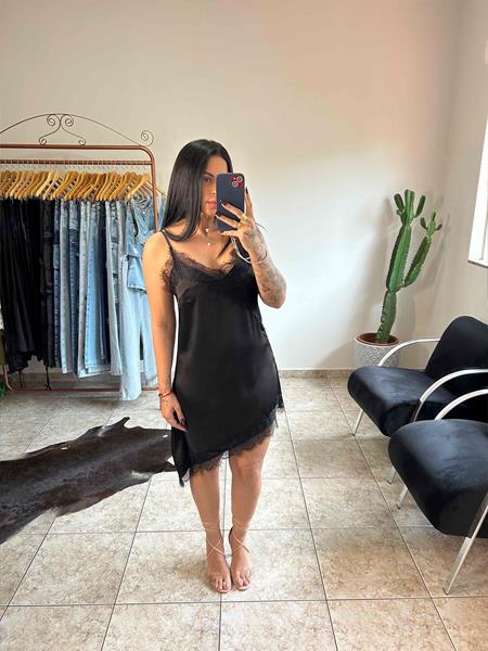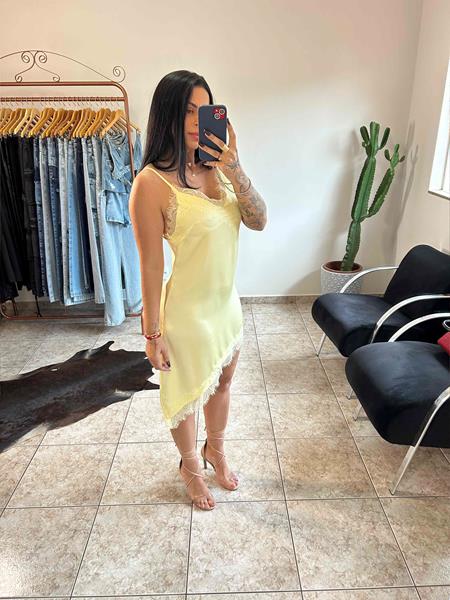 Feito em cetim fluido com brilho leve, esse vestido traz modelagem assimétrica e detalhes em renda delicada, deixando o visual super feminino e sofisticado. As alcinhas finas e o caimento soltinho garantem conforto e movimento, perfeito pra arrasar em eventos, jantares ou festas.