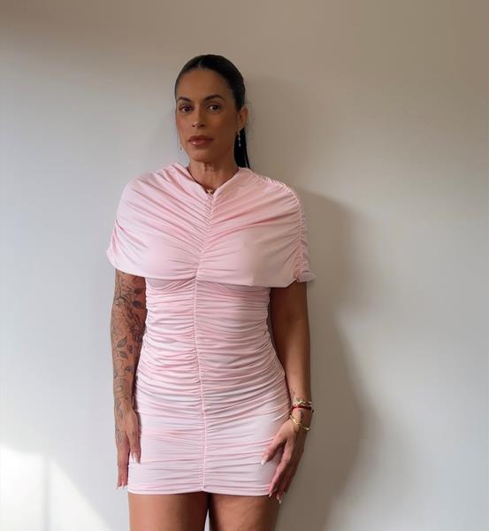 Com modelagem justinha, tecido com franzidos que valorizam as curvas e gola alta com detalhe estruturado nos ombros, esse vestido é pura elegância com um toque de ousadia.